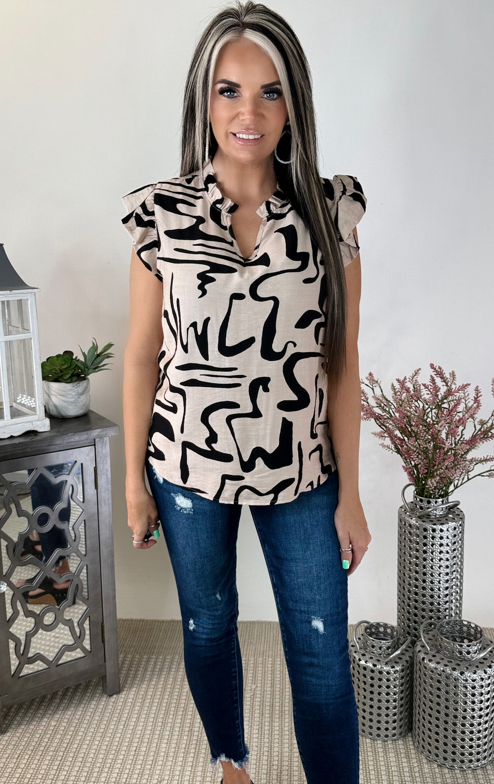 Bold and artsy with a neutral base—this top was made to turn heads. Features soft ruffle sleeves and a relaxed silhouette. Pair it with denim or black skinnies for that effortless chic look.