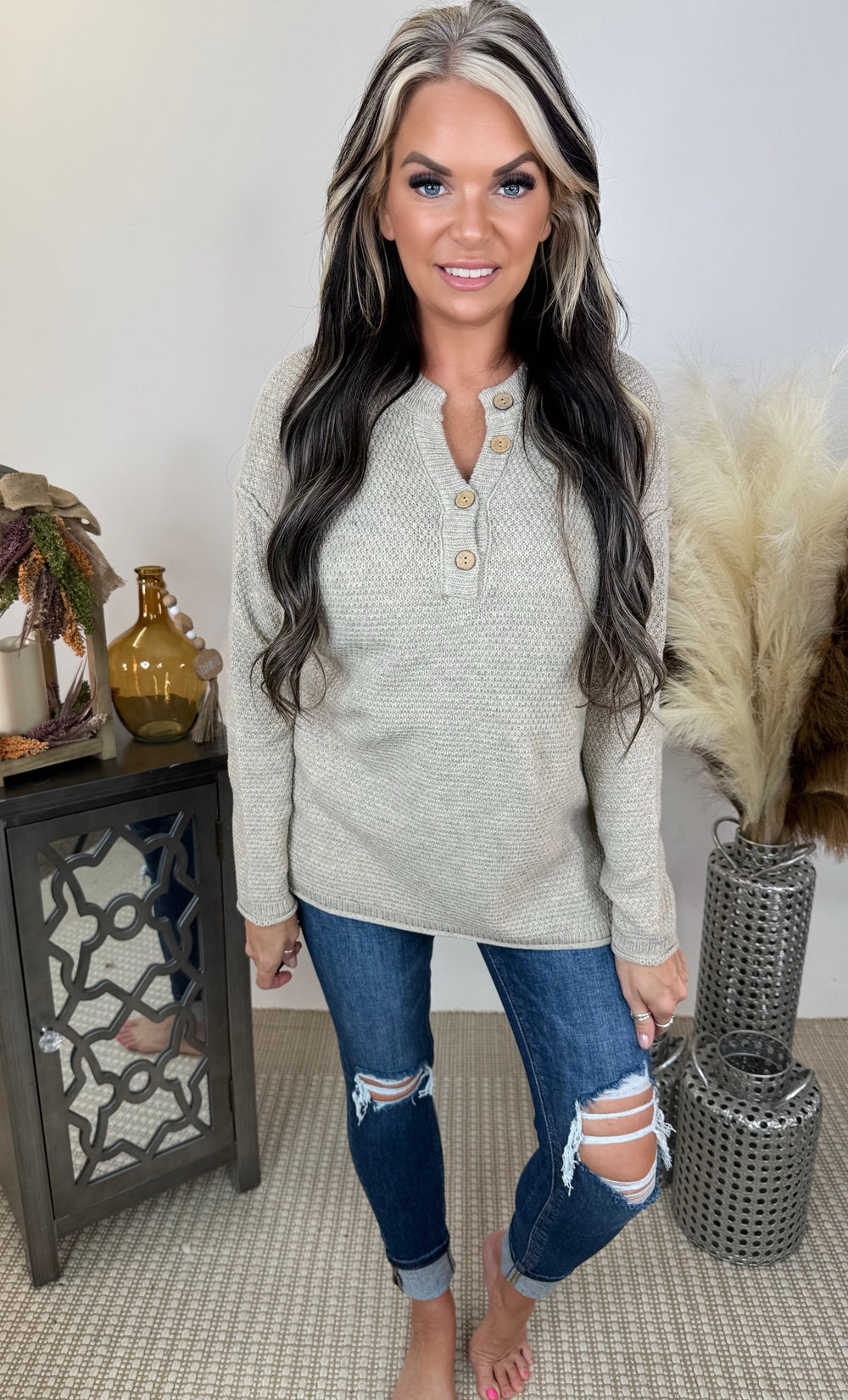 Elevate your fall wardrobe with our 4-Button Henley Neckline Basic Sweater! This midweight sweater features a true-to-size, relaxed fit with side slits for added comfort and movement. The classic Henley neckline, adorned with four stylish buttons, enhances the sweater’s versatile design. Made from 100% acrylic, it provides warmth and durability while maintaining its shape. Perfect for layering or wearing solo, this sweater is an essential piece for any fall occasion