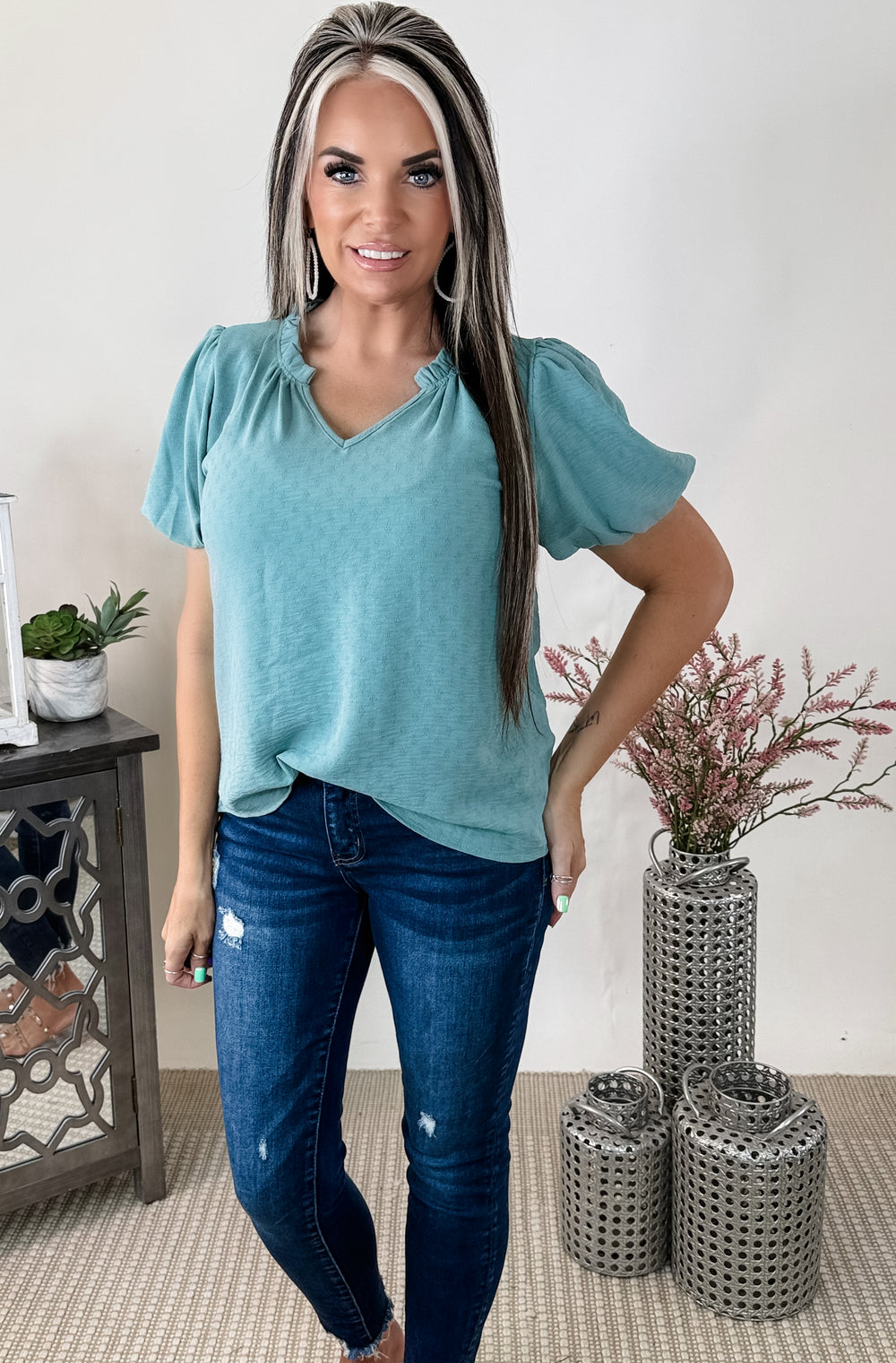 A dreamy sage tone with sweet ruffle details? Say less. This top is made for coffee dates, errands, or a chill day out and about