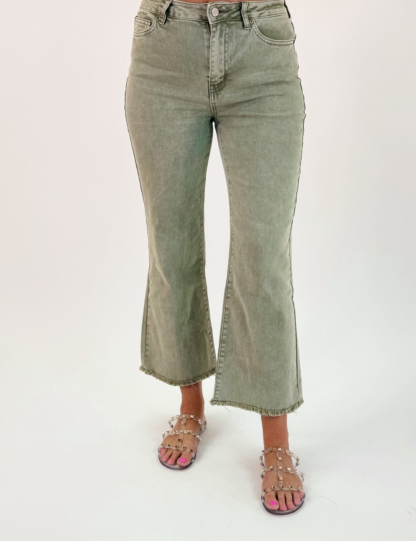 These bootcut crop jeans feature an acid wash finish with a raw hem, offering a fresh look without any distressing. Perfectly playful and effortlessly cool