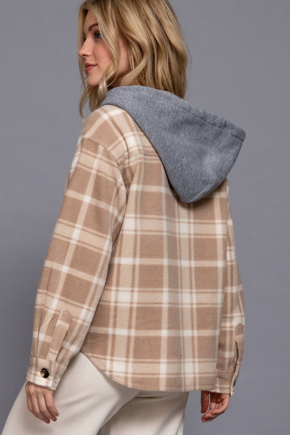Plaid Button Down with Hoodie Fleece shacket:-mocha/ivory