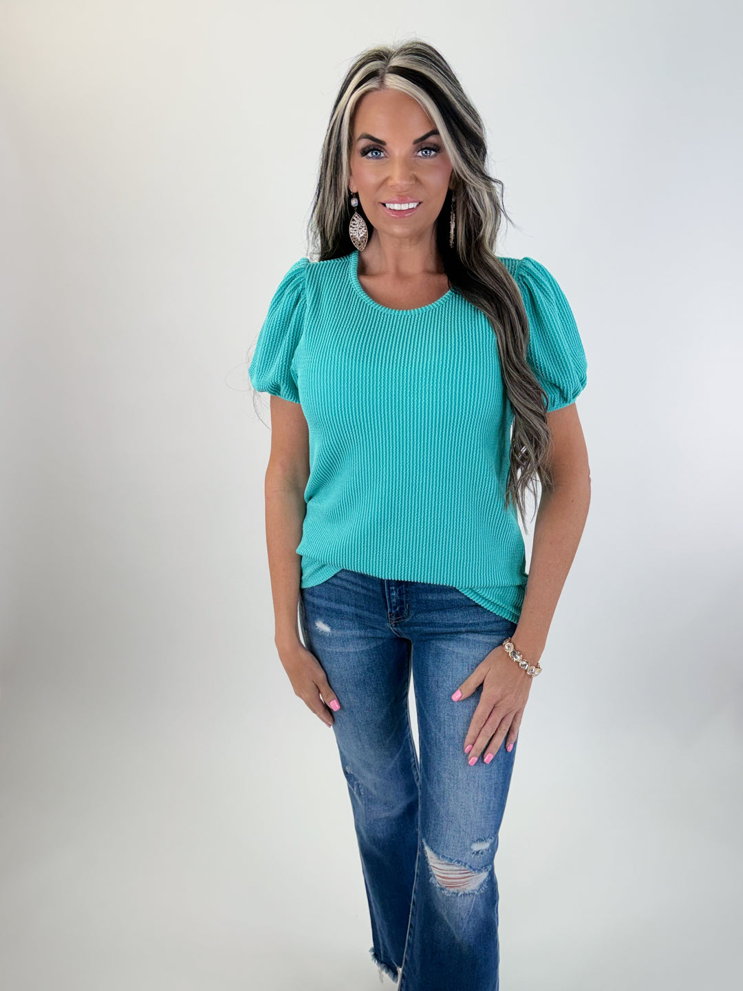 Coastal Breeze Puff Sleeve Ribbed Top