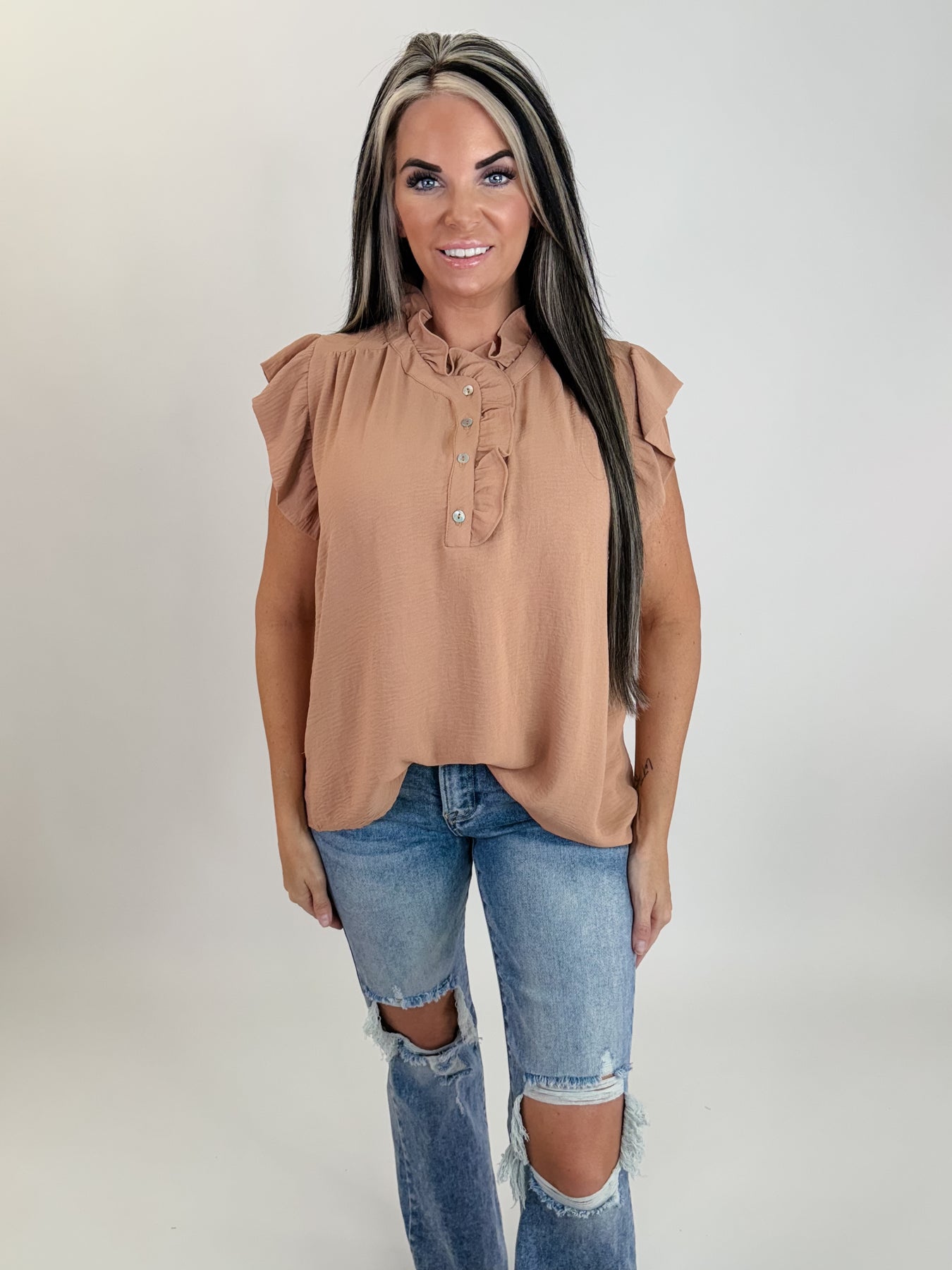 This elegant solid top features stylish ruffled sleeves and delicate button details for a chic, feminine touch. Crafted from soft, breathable fabric, it offers a comfortable fit perfect for any occasion. Dress it up or down effortlessly for a polished, versatile look that complements any wardrobe.