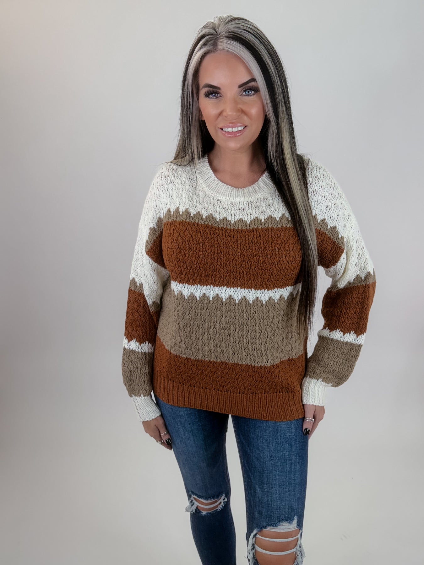 A sweater that feels like fall in clothing form. With wide colorblock stripes in cream, taupe, and rust, this knit is both classic and cozy. The relaxed fit makes it perfect for layering, while the soft texture keeps it comfortable for all-day wear. Pair with denim and booties for a styled seasonal look that never goes out of trend.