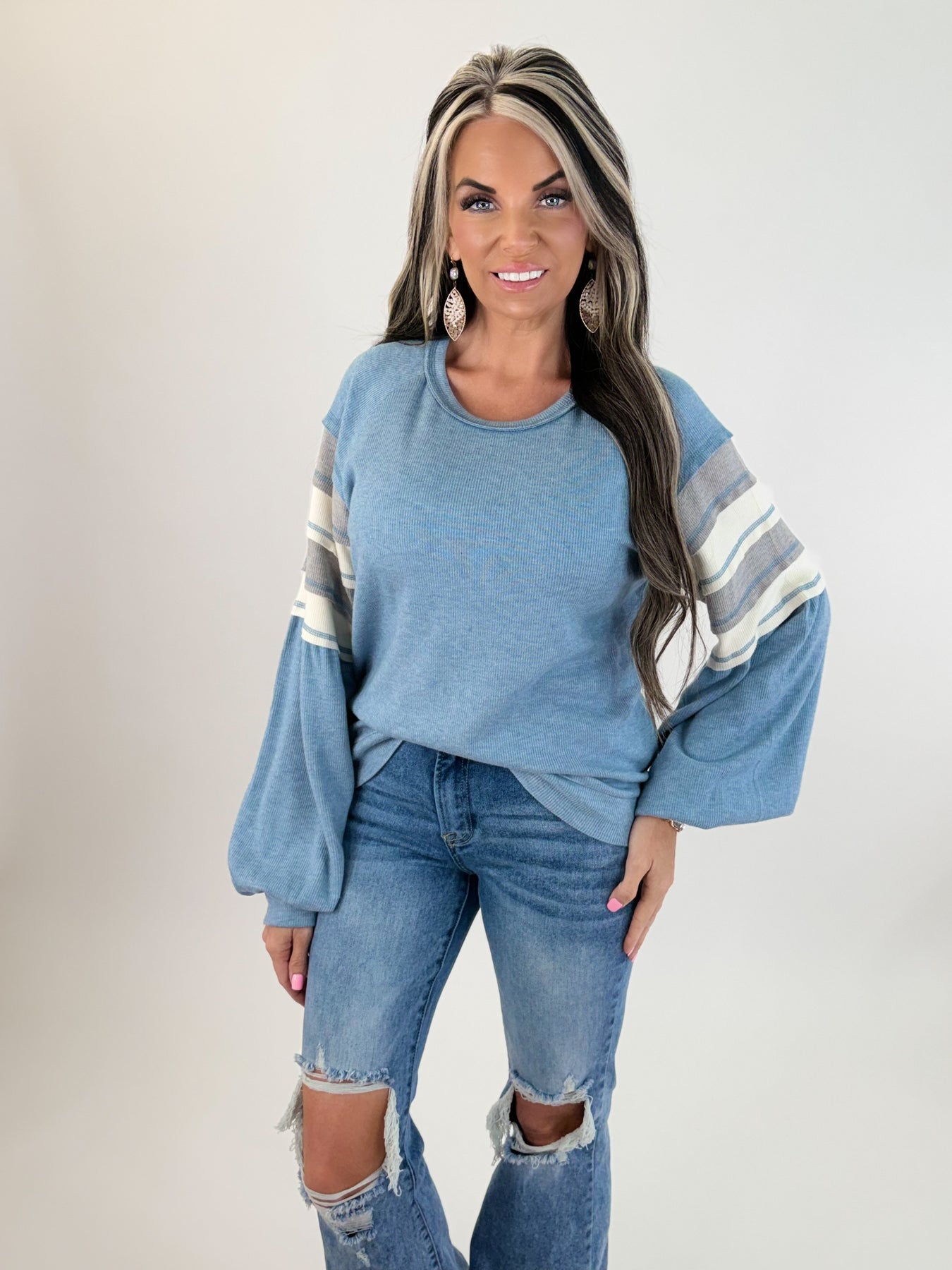 This one is giving comfy but elevated 🤍 The soft blue base with the striped sleeve detail makes it feel special without trying too hard. Those balloon sleeves are flattering and cozy, and the relaxed fit makes it perfect for school drop-offs, errands, or casual dinners.