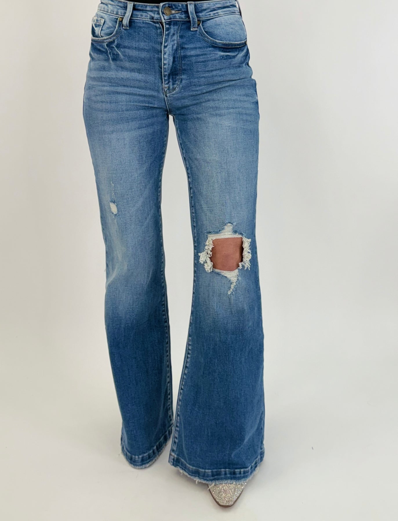 10.75" Rise, 34" Inseam, '70s-inspired flare jeans - Leg opening : 26" - Knee distressed - Button closure and zip fly - 5-pocket styling
